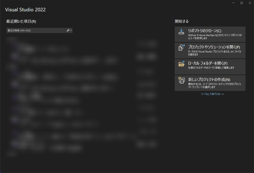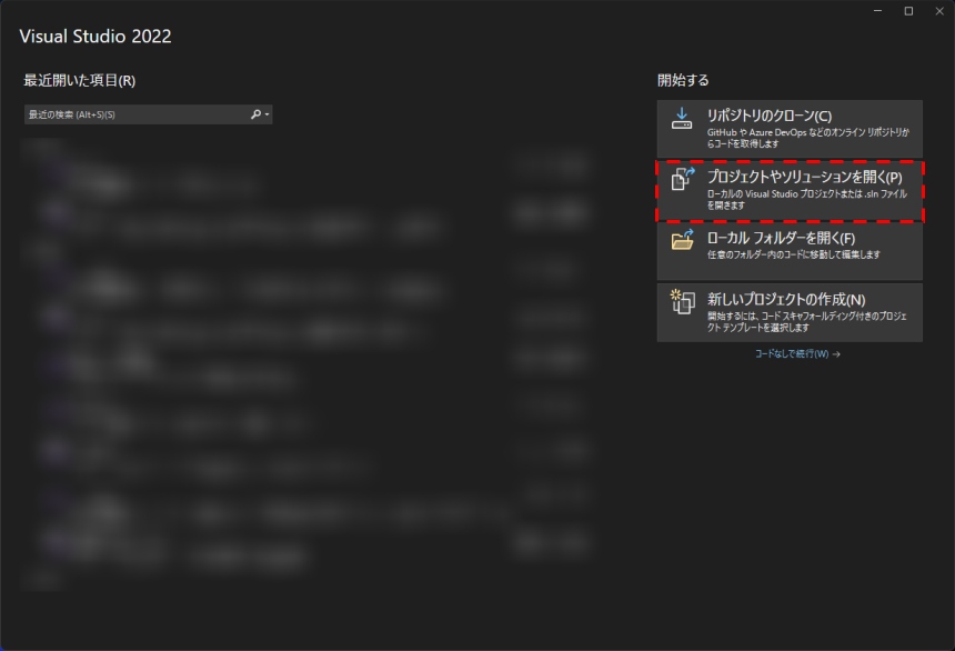 1.Visual Studioを起動し、「プロジェクトやソリューションを開く」をクリックします。