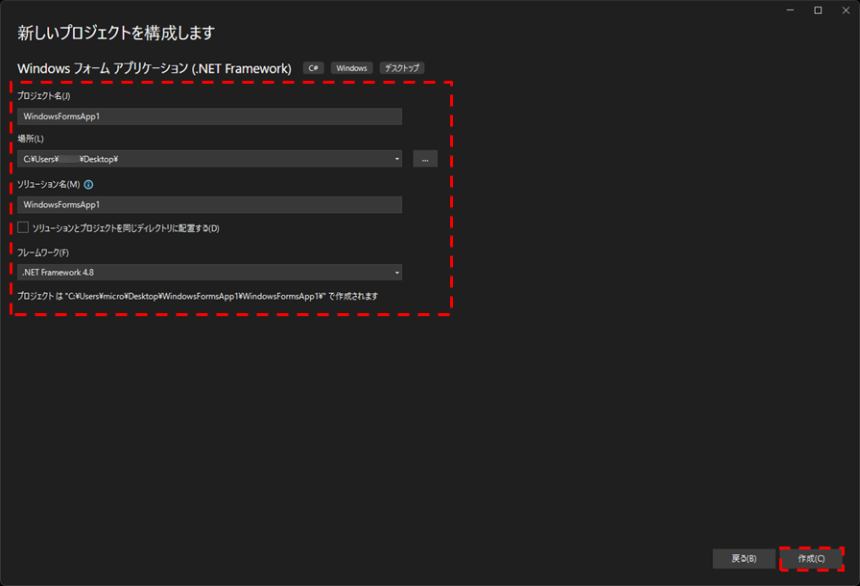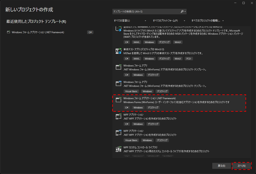 2.プロジェクトのテンプレート選択画面が表示されます。C#の「Windowsフォームアプリケーション(.NET Framework)」を選択し、「次へ」をクリックします。