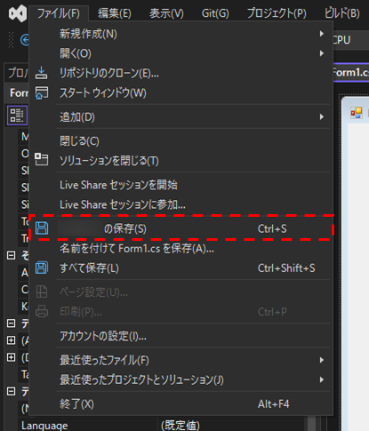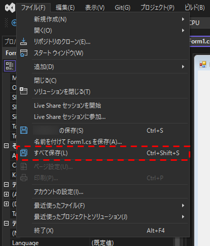 メニューバーの「ファイル」から「すべて保存」をクリックします。ソリューションに含まれるすべてのファイルをまとめて保存します。