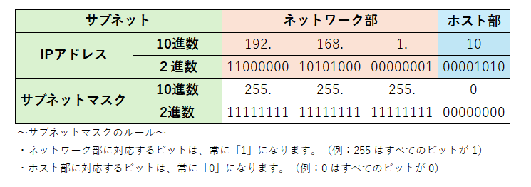 サブネットマスクもIPアドレスと同様に「255.255.255.0」のような形式で表現されます。