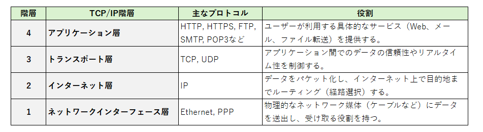 | IP | Internet Protocol | データをパケット化し、IPアドレスを元に配送するためのプロトコル。 |