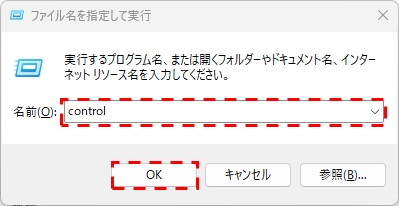 2. 名前に「control」と入力し、「OK」をクリックすると、コントロールパネルが開きます。