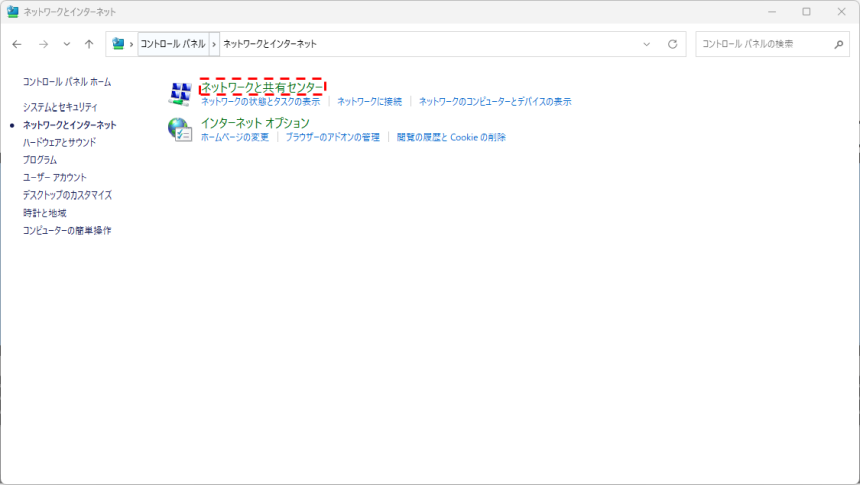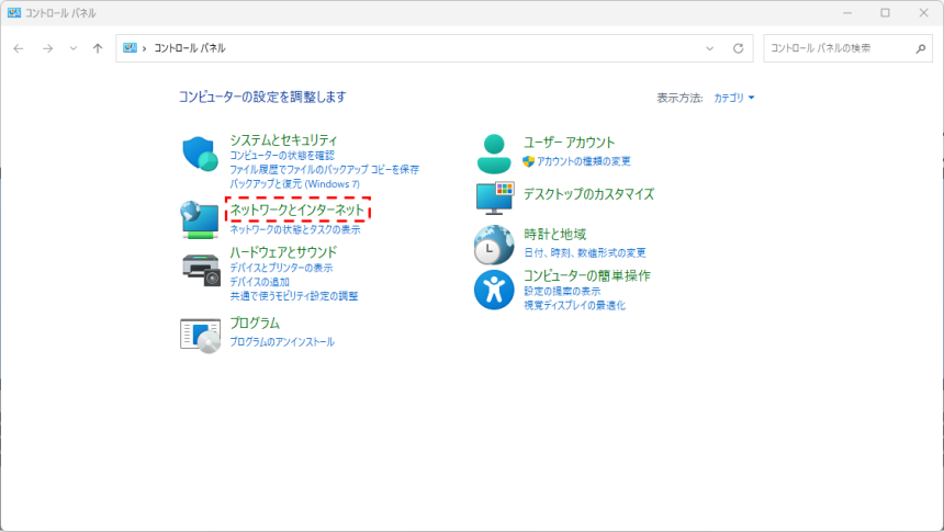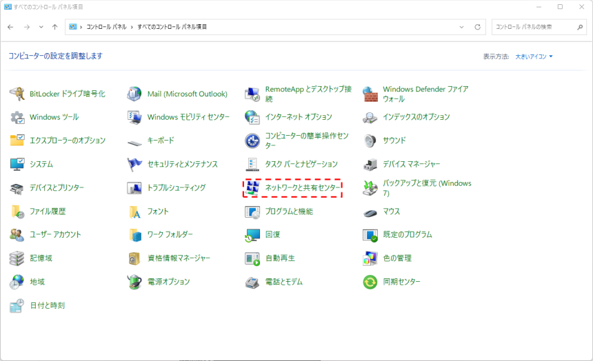 コントロールパネルのメニュー構成が以下の場合は、「ネットワークと共有センター」をクリックし、手順「5」まで進んでください。