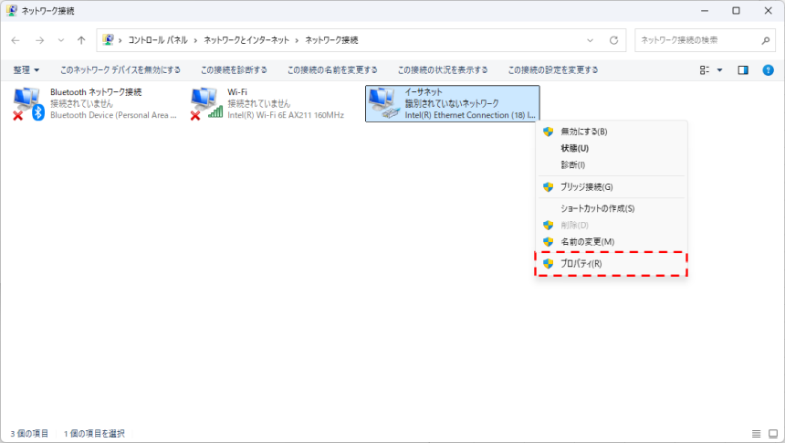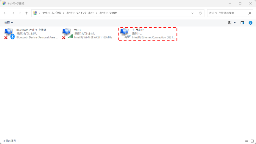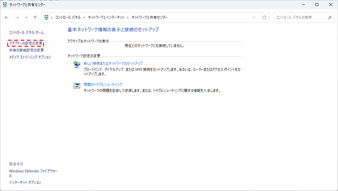 対象のアダプターに「メディアは接続されていません」と表示される場合は、以下を確認してください。