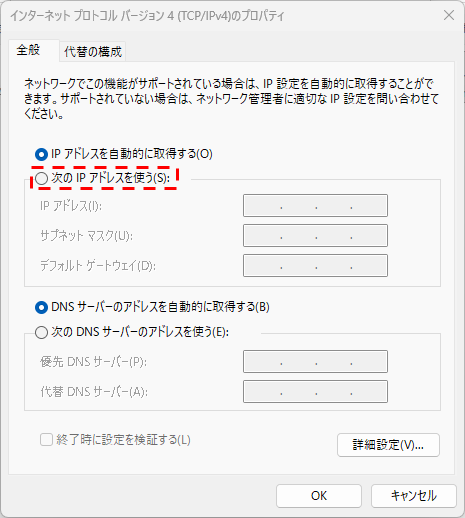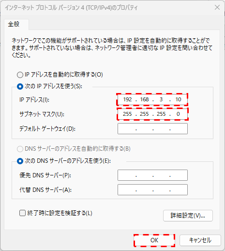 10. 「IPアドレス」と「サブネットマスク」を以下のように設定を行い、「OK」をクリックします。