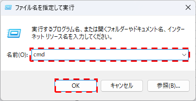 2. 名前に「cmd」と入力し、「OK」をクリックすると、コマンドプロンプトが開きます。