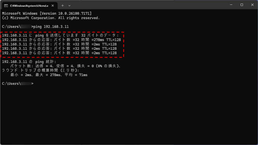 192.168.3.11 からの応答: バイト数 =32 時間 =278ms TTL=128