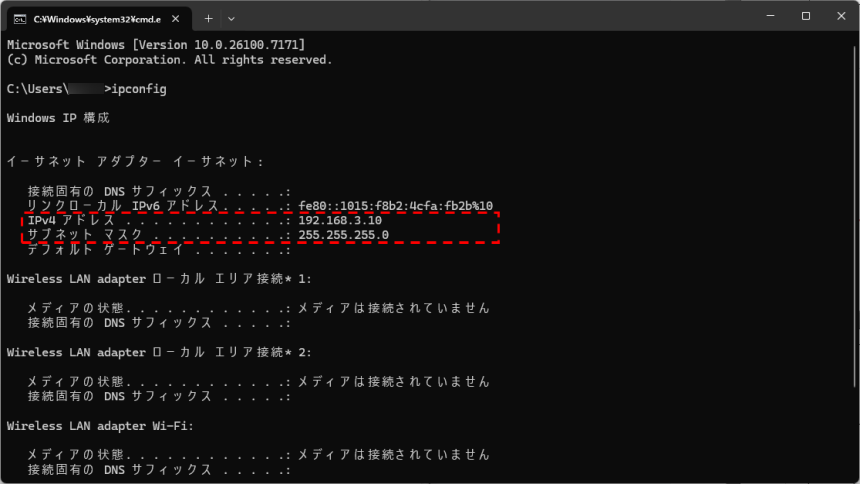IPv4 アドレス . . . . . . . . . . . .: 192.168.3.10