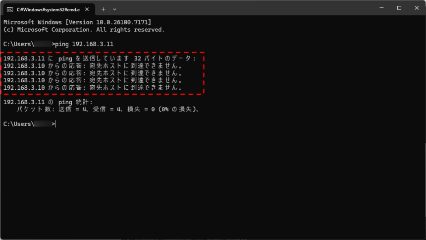 192.168.3.11 からの応答: バイト数 =32 時間 =2ms TTL=128
