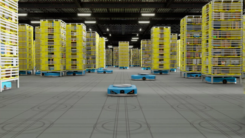 多くの搬送ロボットが縦横無尽に走り回り、大きな棚をスレスレで走行する様子は圧巻でした。