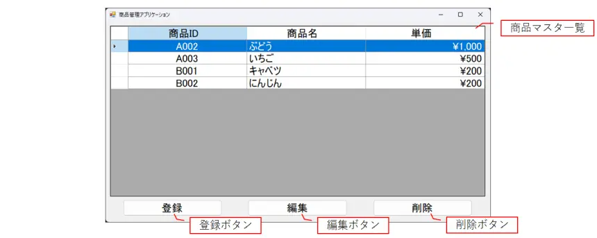 | 商品マスタ一覧 | DataGridView | |