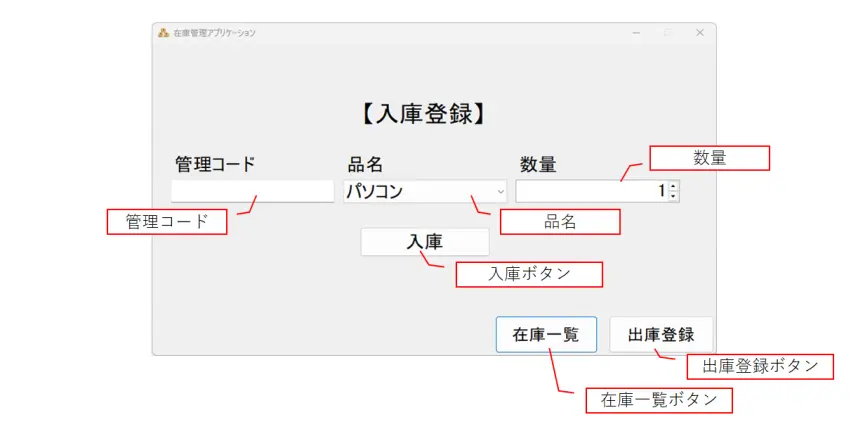 入力された管理コードが在庫テーブルに登録されている場合は、エラーダイアログを表示します。 - 「在庫一覧ボタン」をクリックすると、「在庫一覧画面」に遷移します。