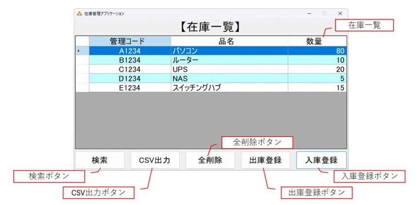 - 「管理コード」、「品名」、「数量」を入力し、「入庫ボタン」をクリックすると、在庫テーブルにデータを追加します。