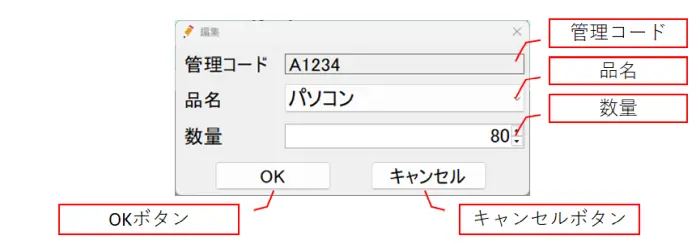 品名と数量を編集し、「OKボタン」を押すと、データを更新します。
