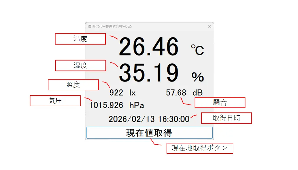 3. 取得した各データとデータを取得した日時を画面に表示します。