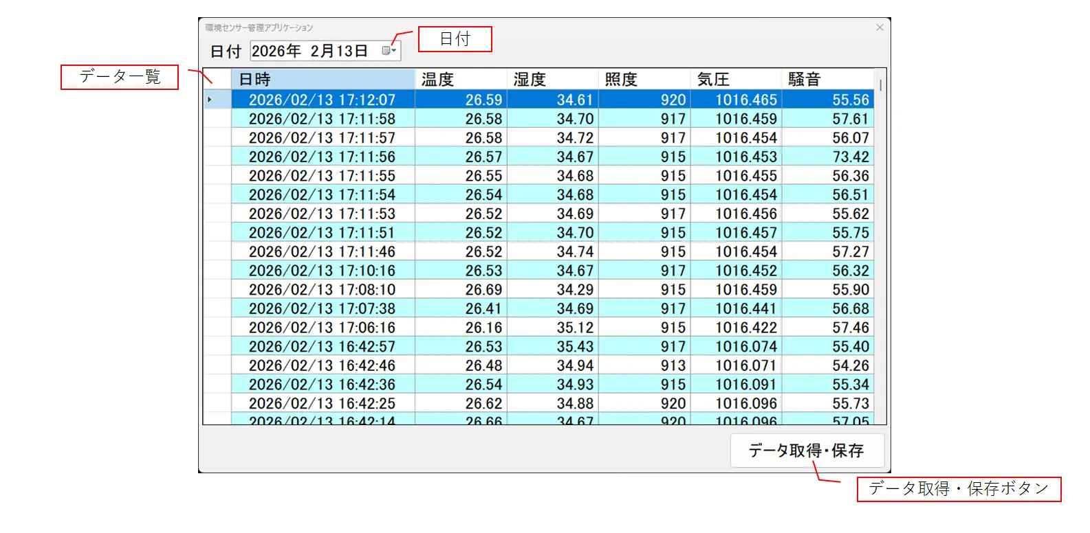 1. 「データ取得・保存ボタン」をクリックすると、環境センサーへソケット通信で接続します。