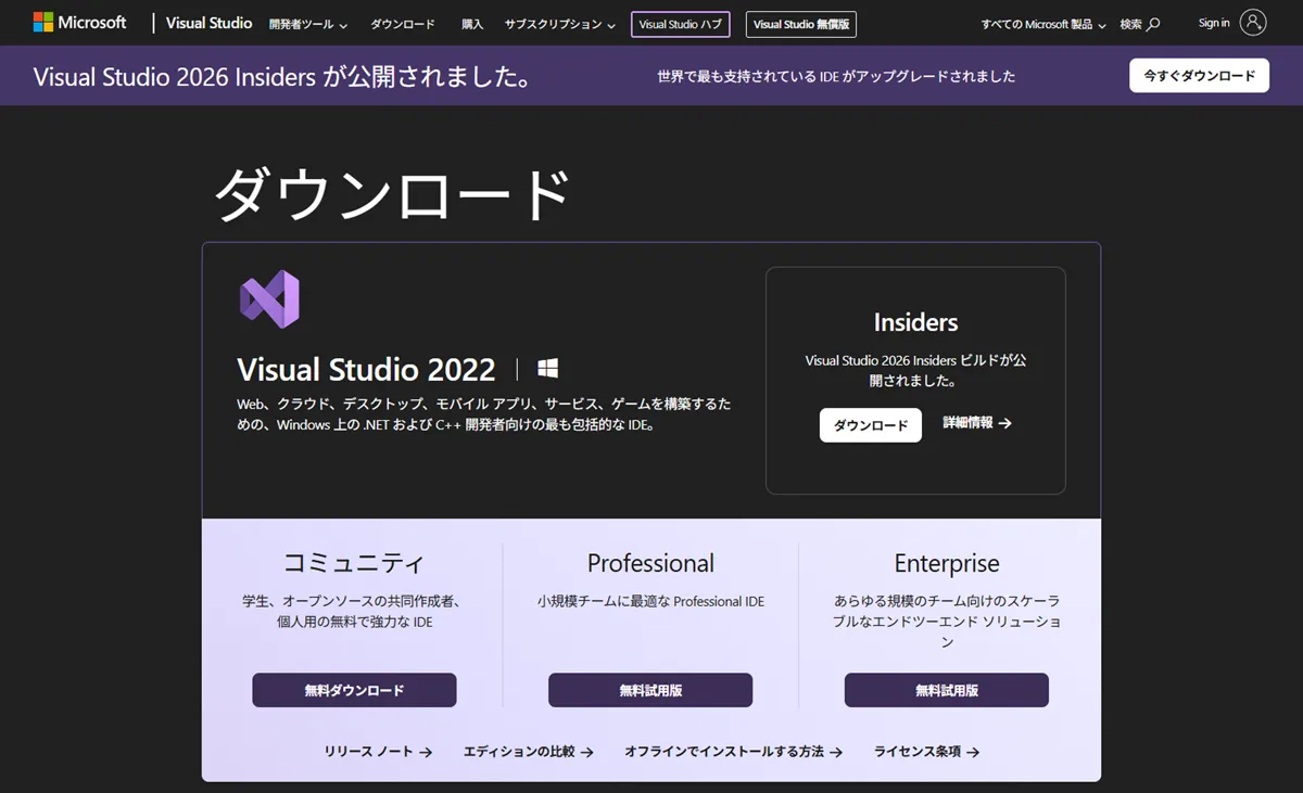 今回は、その無償版「Visual Studio 2022 Community」のインストール方法について解説します。