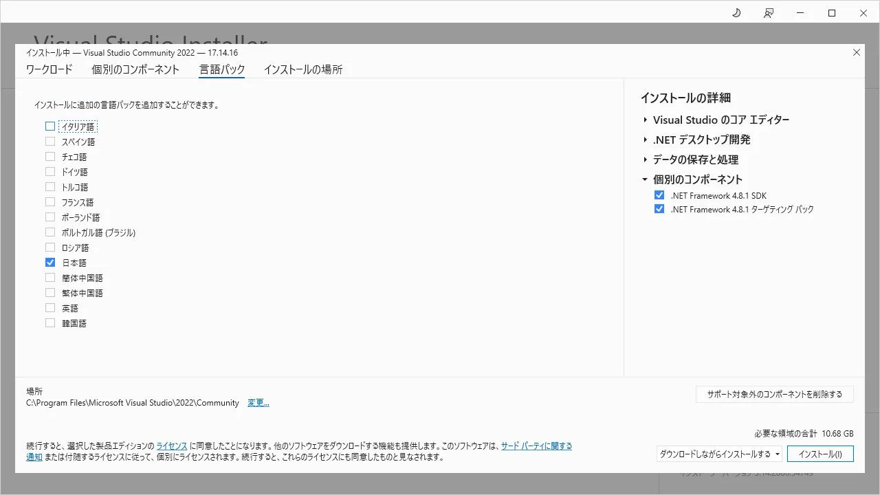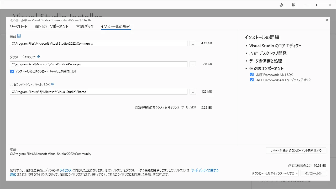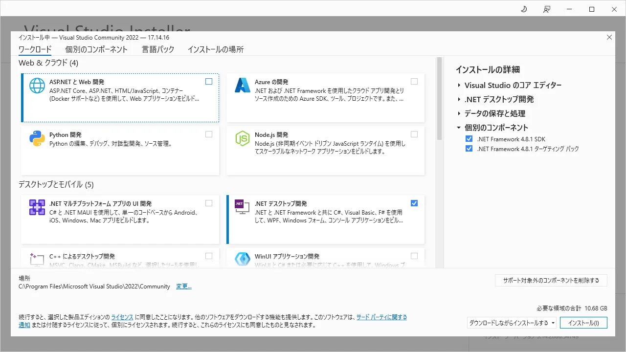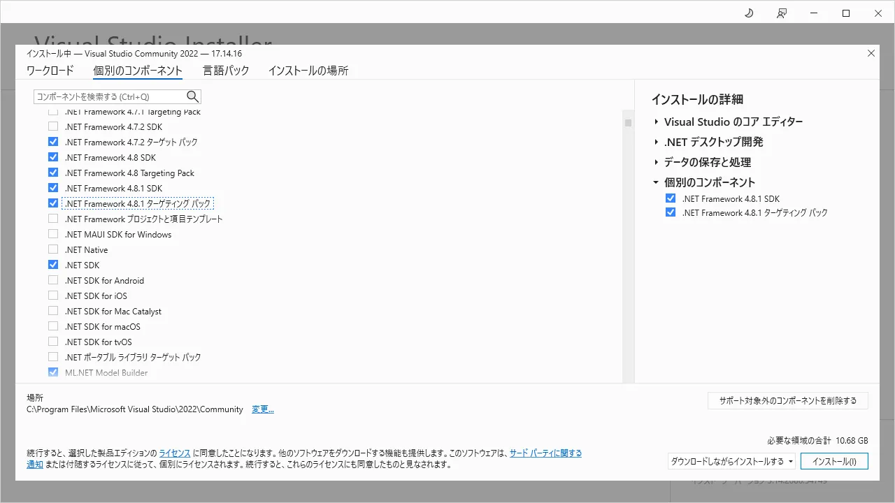 アルチテックでは必要なため、「.NET Framework 4.8.1 SDK」と「.NET Framework 4.8.1 ターゲティング パック」を追加で選択しました。