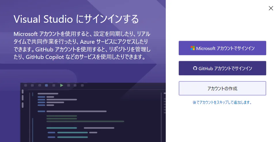 Visual Studio Community では、サインインする必要はありません。「スキップ」をクリックしてください。