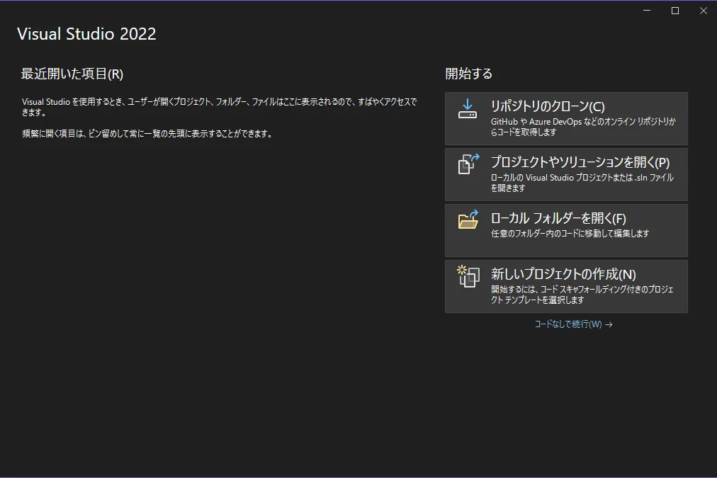 デスクトップに「Visual Studio 2022のショートカット」が生成されているので、ダブルクリックをして起動させます。