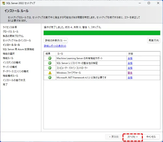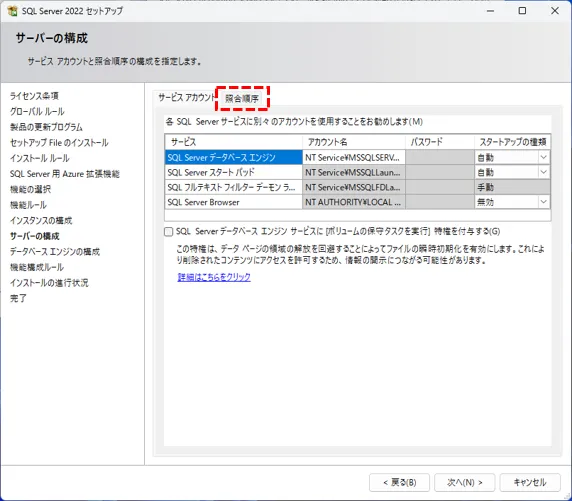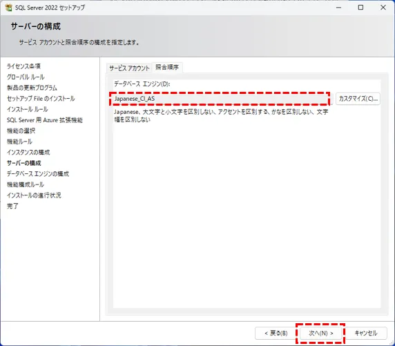 12.「Japanese_CI_AS」であることを確認し、「次へ」を押下します。