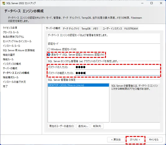 13.「混合モード(SQL Server 認証とWindows 認証)」を選択し、任意のパスワードを入力します。