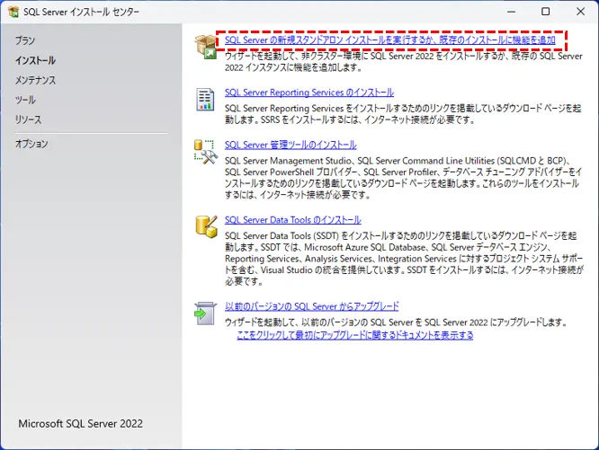 5.「SQL Serverの新規スタンドアロン インストールを実行するか、既存のインストールに機能を追加」をクリックします。