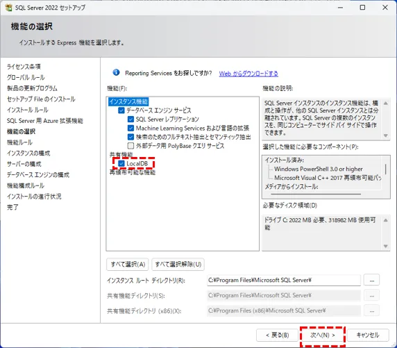 ※ LocalDBが必要な場合は、「LocalDB」にチェックを入れます。