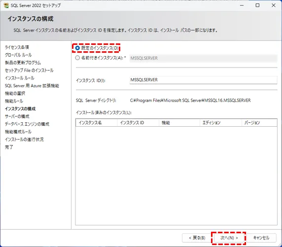 10.「既定のインスタンス」を選択し、「次へ」をクリックします。
