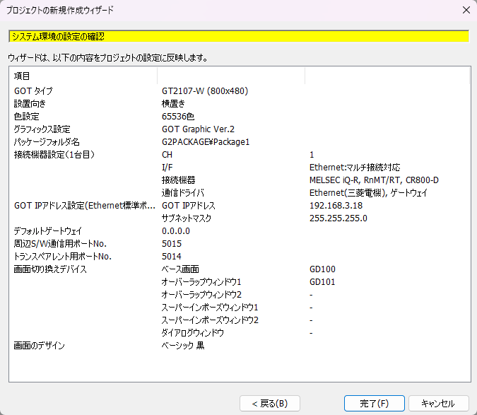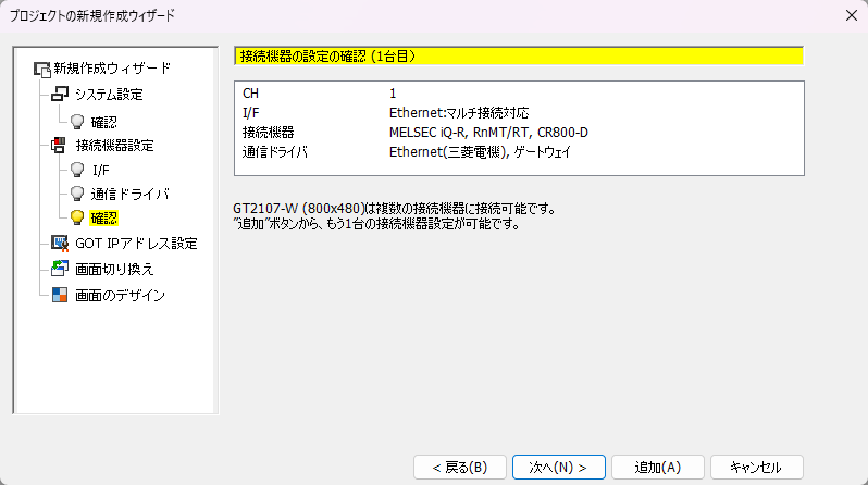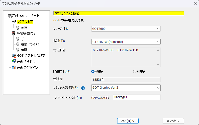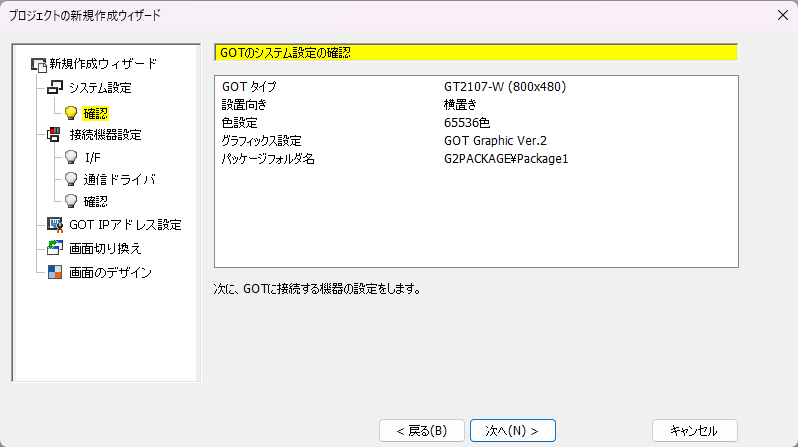 4.「GOTのシステム設定の確認」が表示されます。設定内容を確認して、「次へ」ボタンをクリックします。