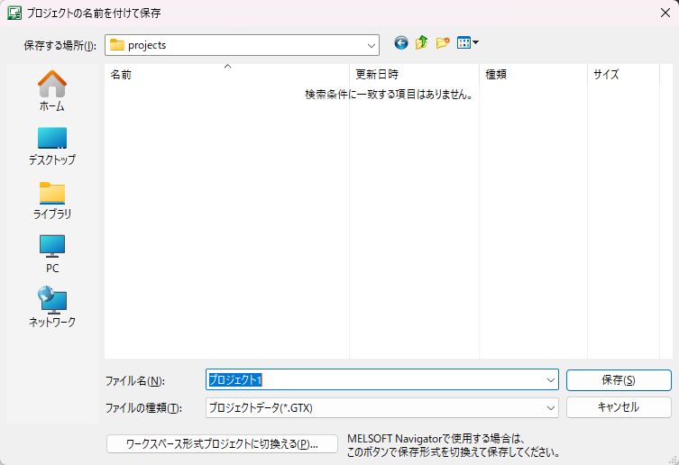 2.「プロジェクトの名前を付けて保存」が表示されます。保存する場所を選択し、ファイル名を入力して「保存」ボタンをクリックします。