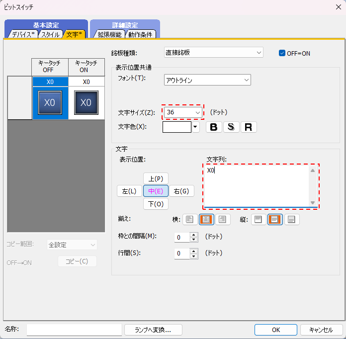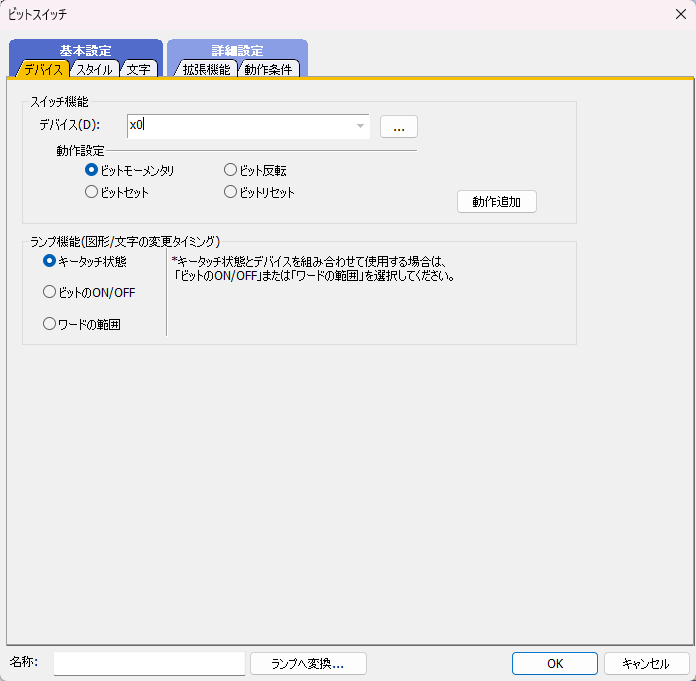 6.「ビットスイッチ」ダイアログが表示されます。デバイスに「x0」を入力します。