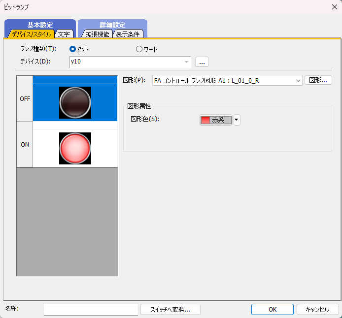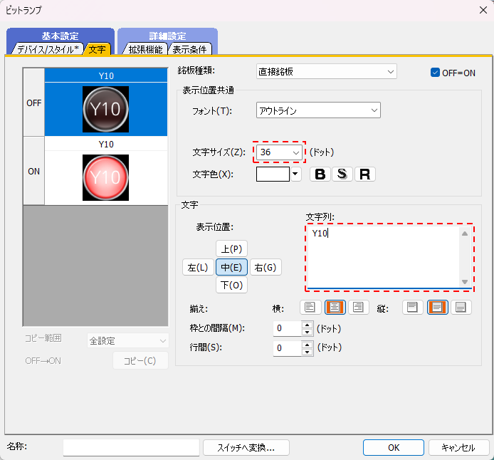 11.「ビットランプ」ダイアログが表示されます。デバイスに「y10」を入力します。