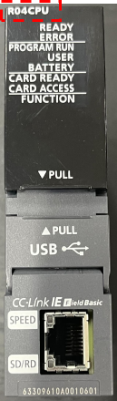 シリーズと機種はシーケンサの型番を確認して選びます。次の写真のCPUの型番は「R04CPU」です。