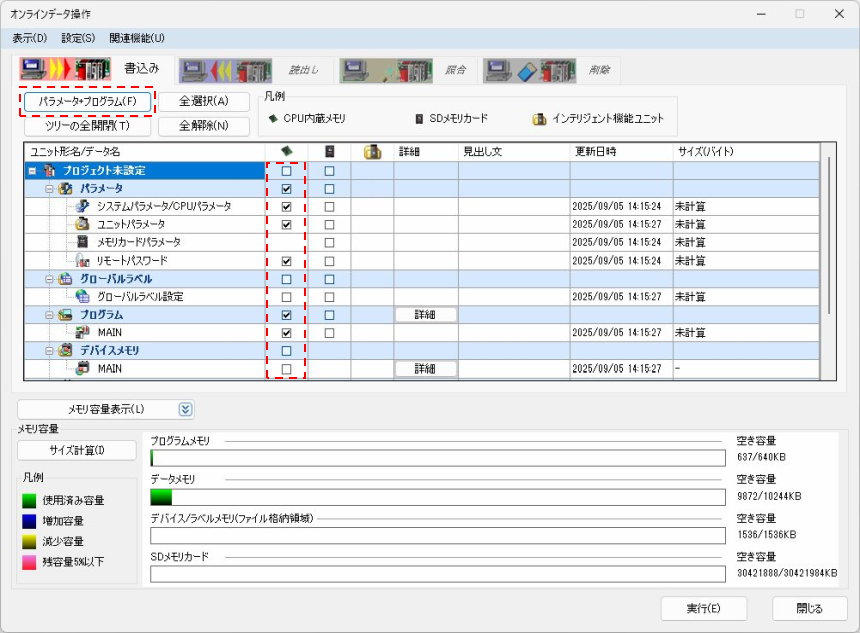 4.「パラメータ+プログラム」ボタンをクリックすると、書き込むデータが選択されます。