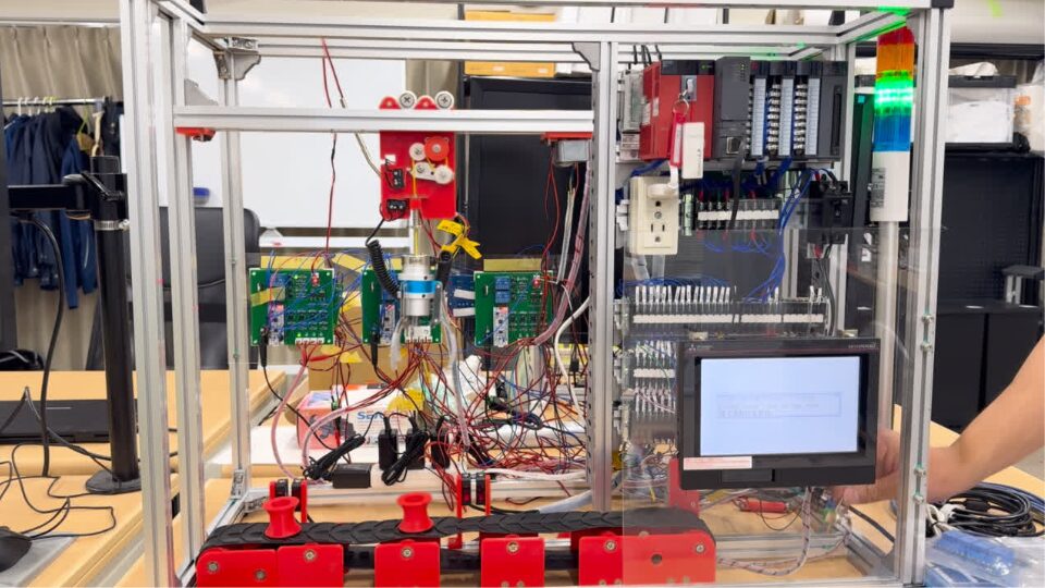 - オリジナルの制御システム実習機を用いて、コンベアやクレーンを実際に動作させて制御システムを開発します。